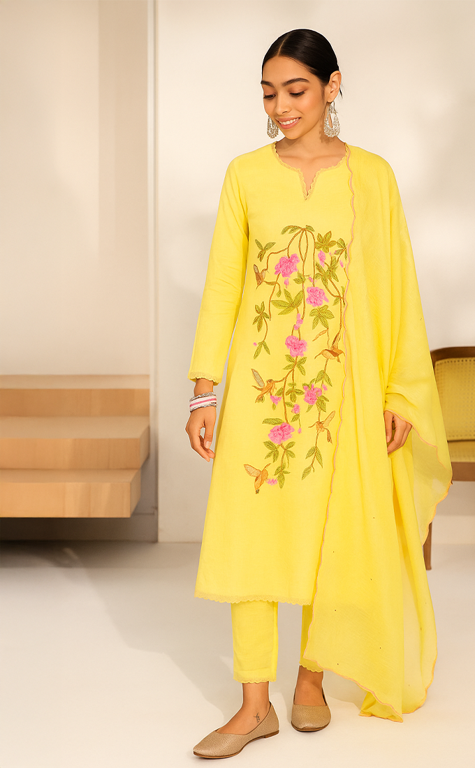 Pure Silk Maheshwari 3-Piece Suit with Kantha Embroidery
