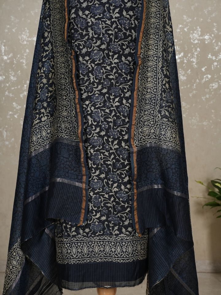 Pure Silk Maheshwari 3-Piece Suit with indigo Printed Top & Imported Bottom