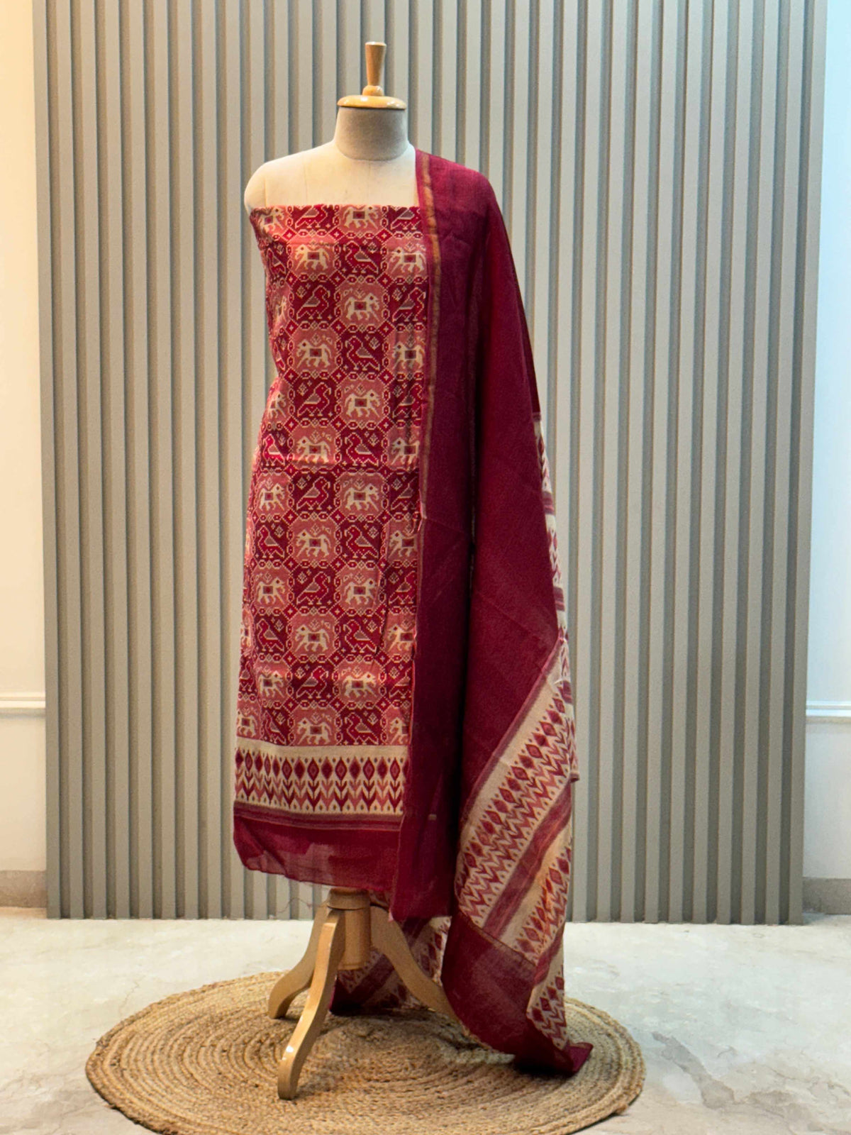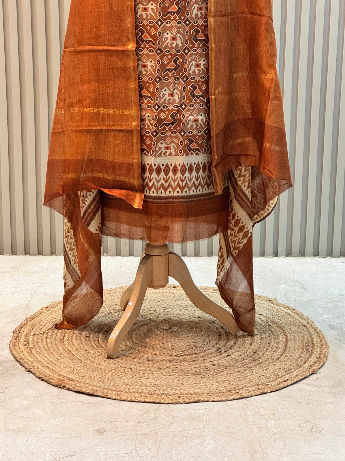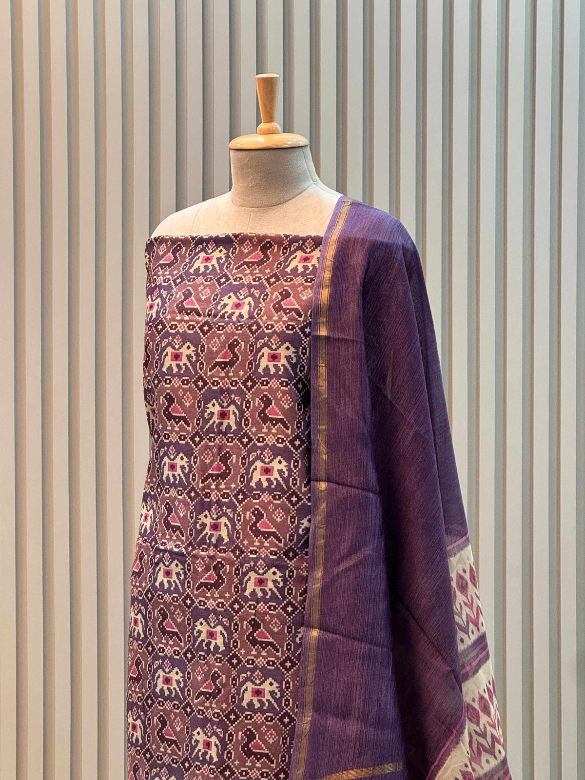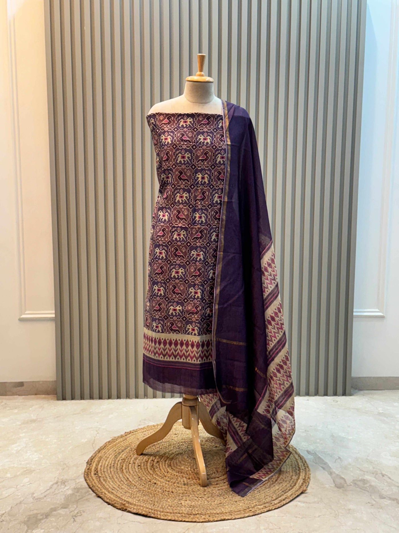 Elevate your ethnic wardrobe with this exquisite Pure Silk Maheshwari Suit, crafted to perfection for a luxurious feel and elegant drape. The suit features rich, vibrant colors that enhance its traditional charm, while the beautifully detailed Patola print adds a touch of timeless heritage. Soft, lightweight, and effortlessly graceful—this ensemble is perfect for festive occasions, parties, and special celebrations.