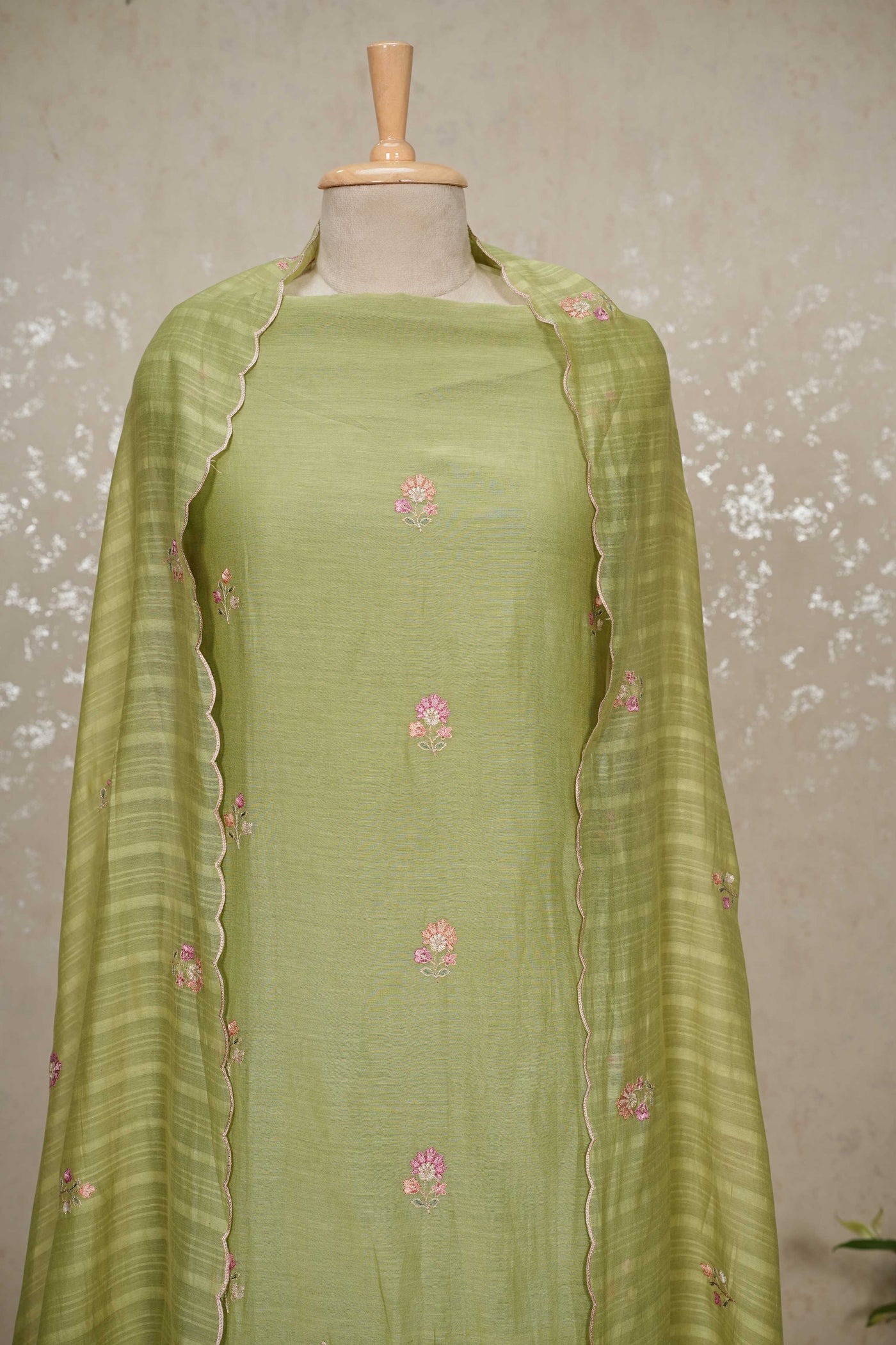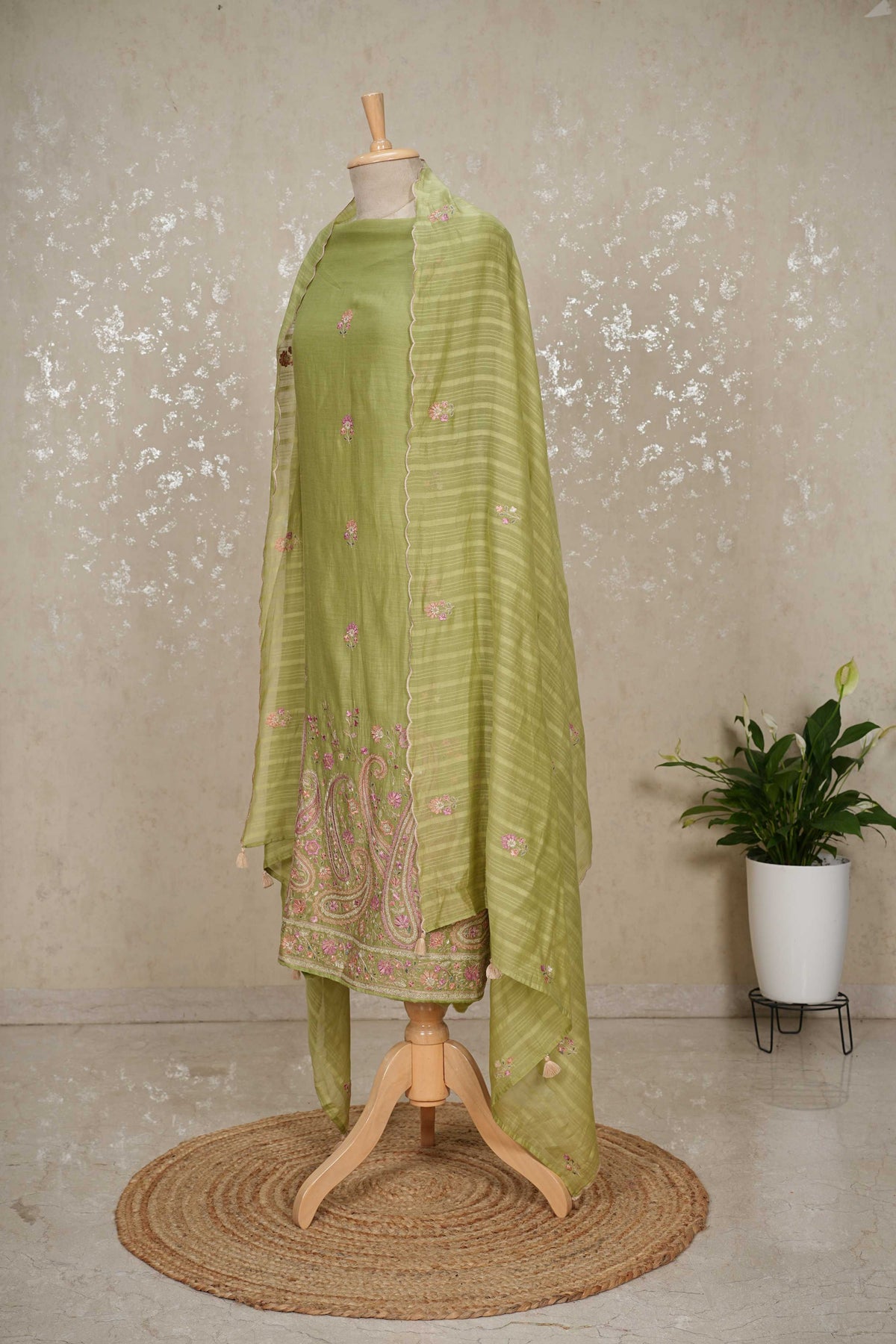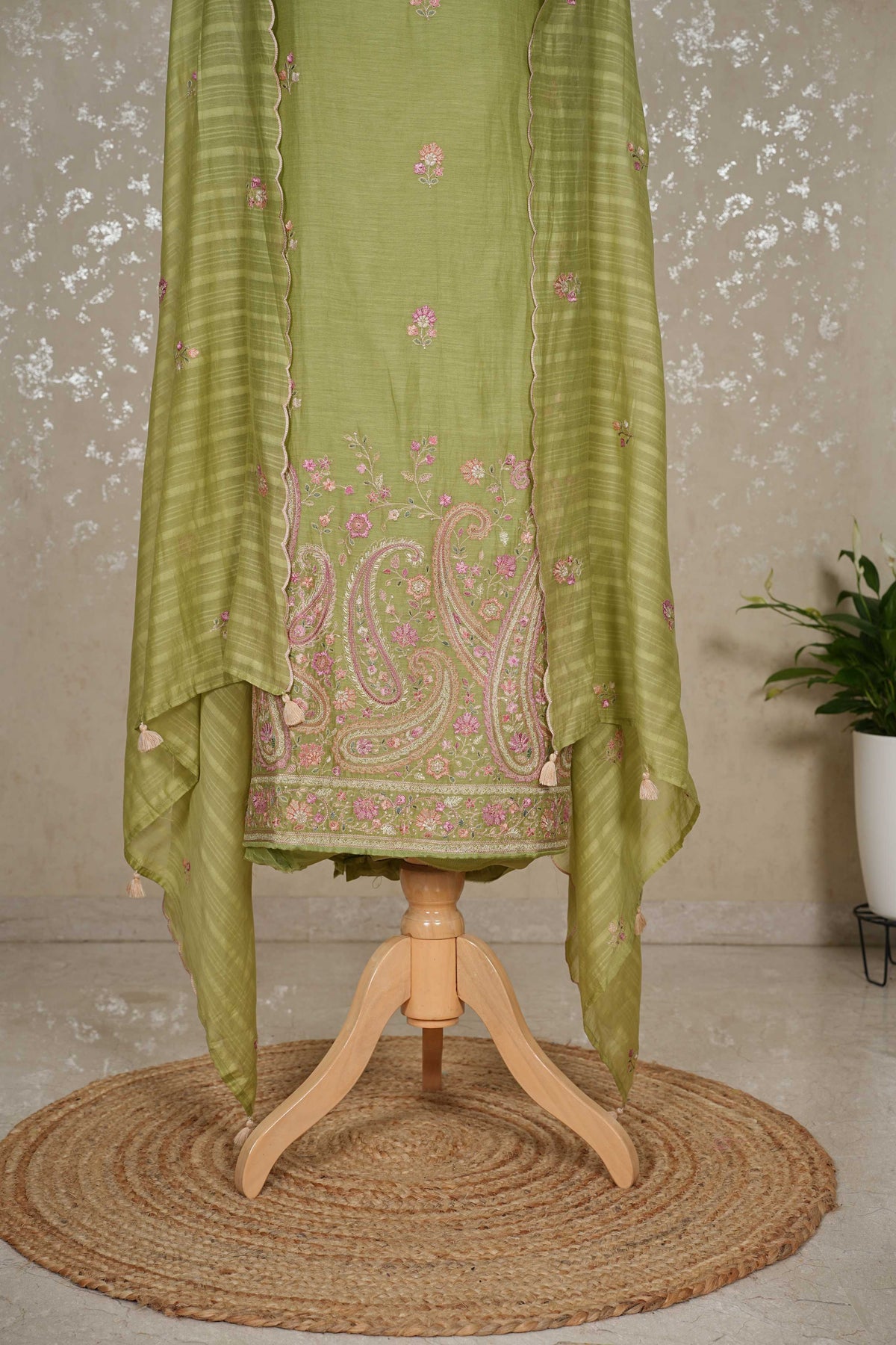 Embrace timeless elegance with this Mul Chanderi 3-piece suit in a beautiful green hue, featuring intricate Kashmiri embroidery. Crafted from premium Chanderi fabric, it offers a lightweight, breathable feel that ensures comfort while maintaining a luxurious appearance.