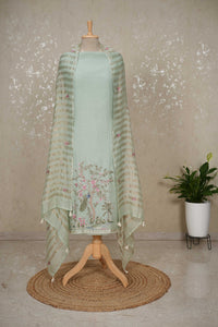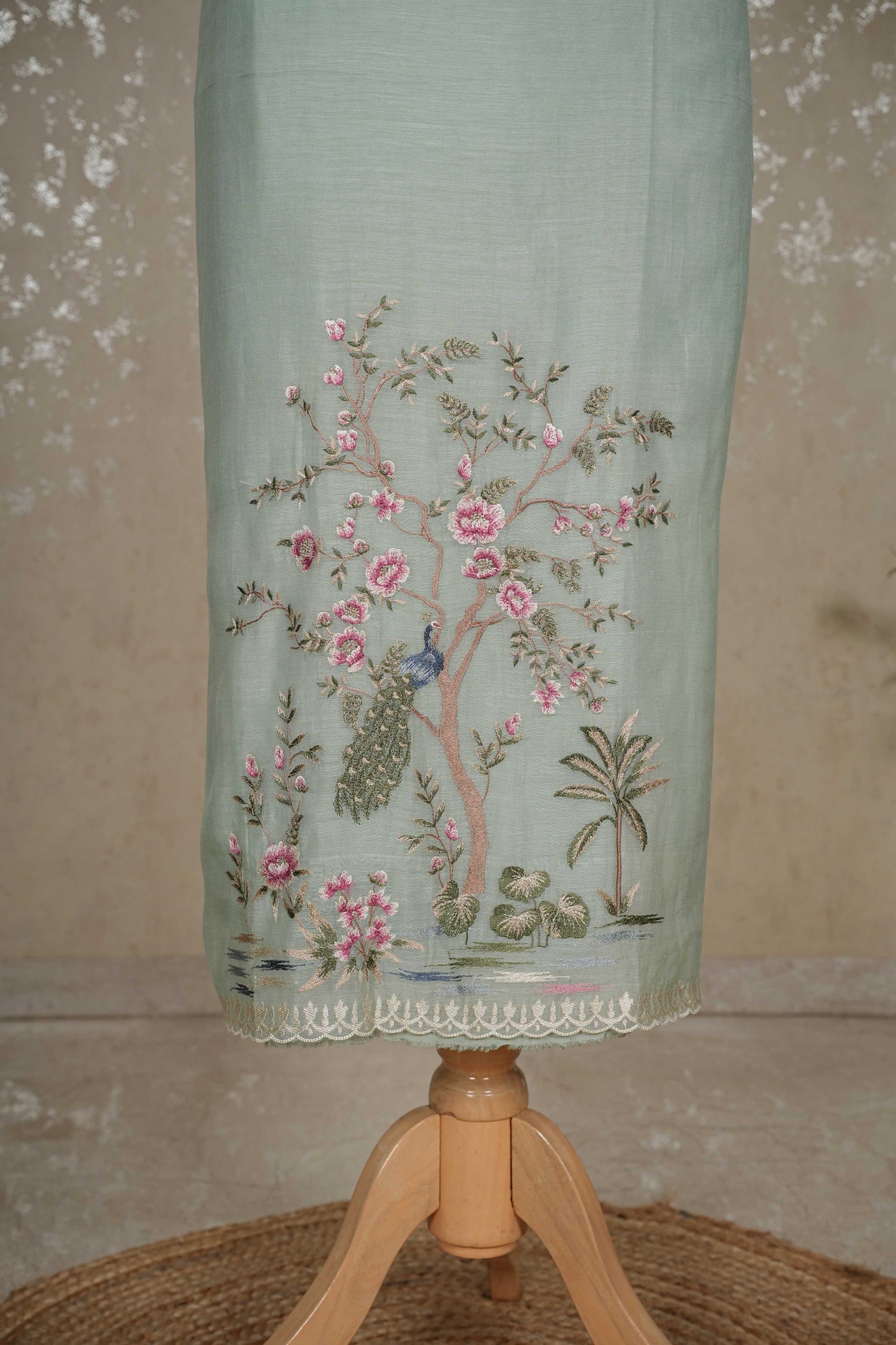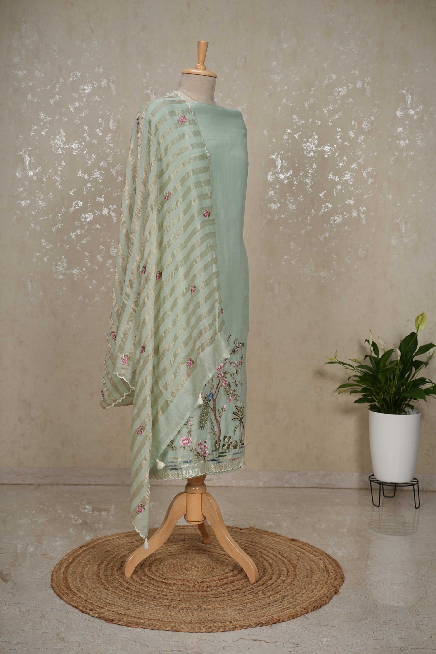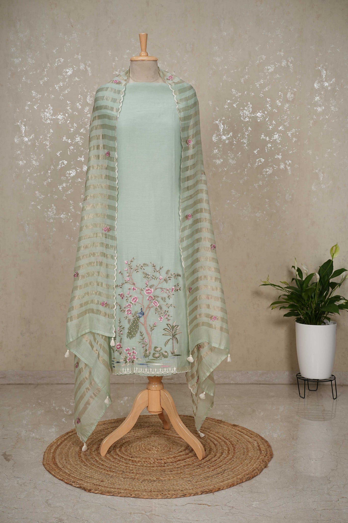 The suit is paired with a beautiful tissue strip dupatta, which adds a subtle sheen and elevates the overall look with sophistication. The intricate peacock design on the kurta highlights traditional craftsmanship, making it a perfect choice for festive gatherings, special occasions, or elegant daywear.