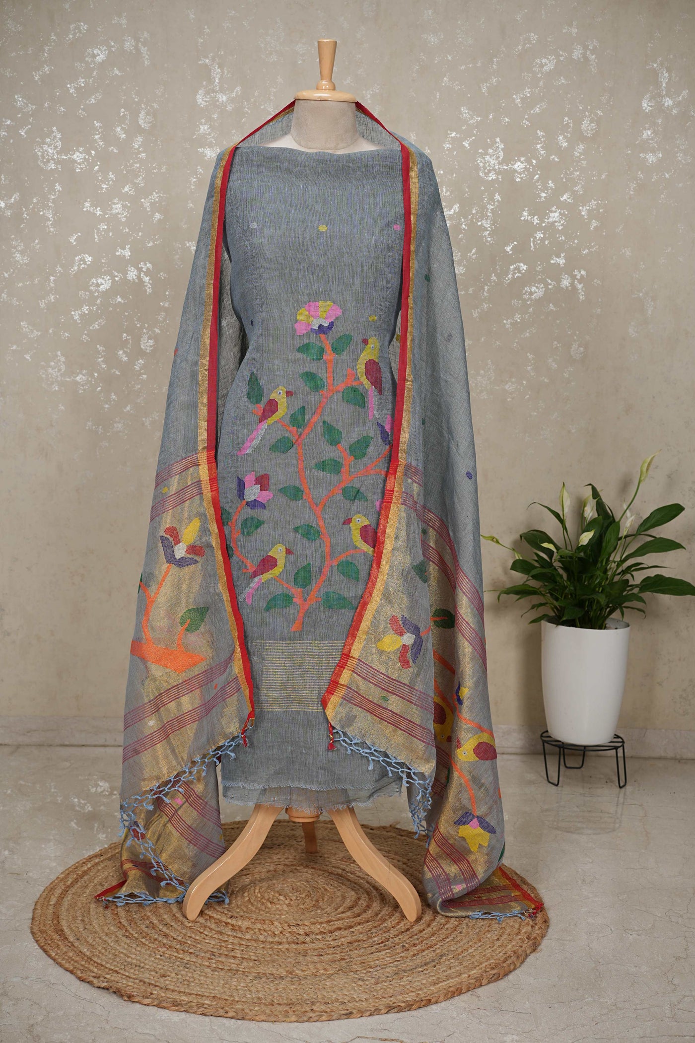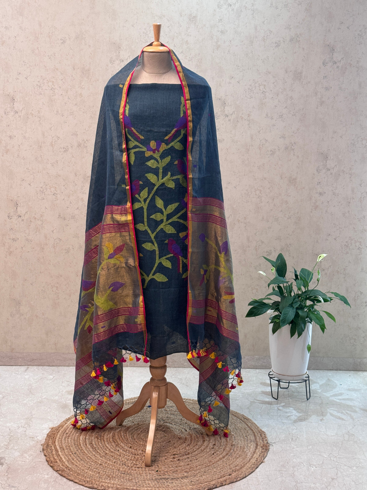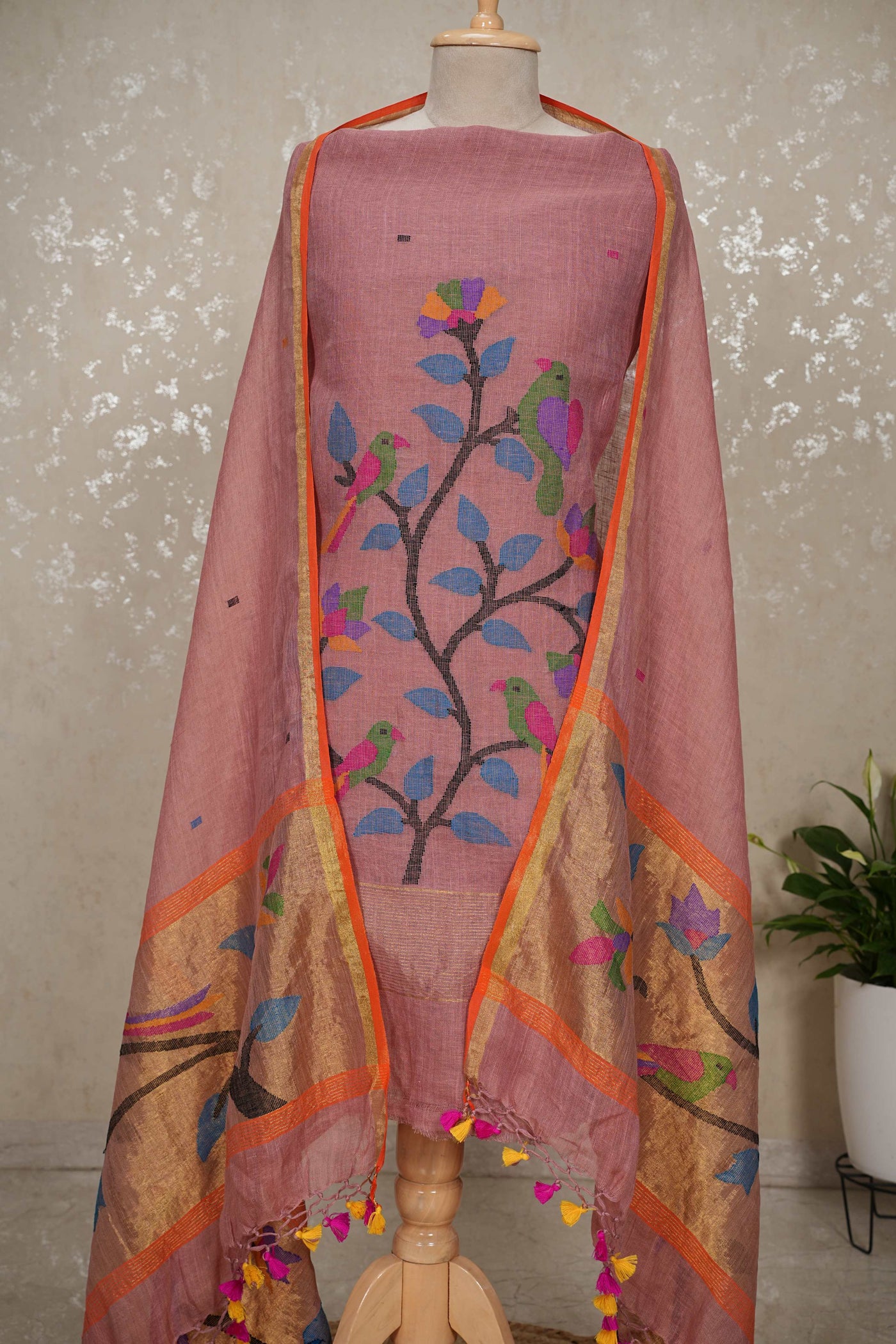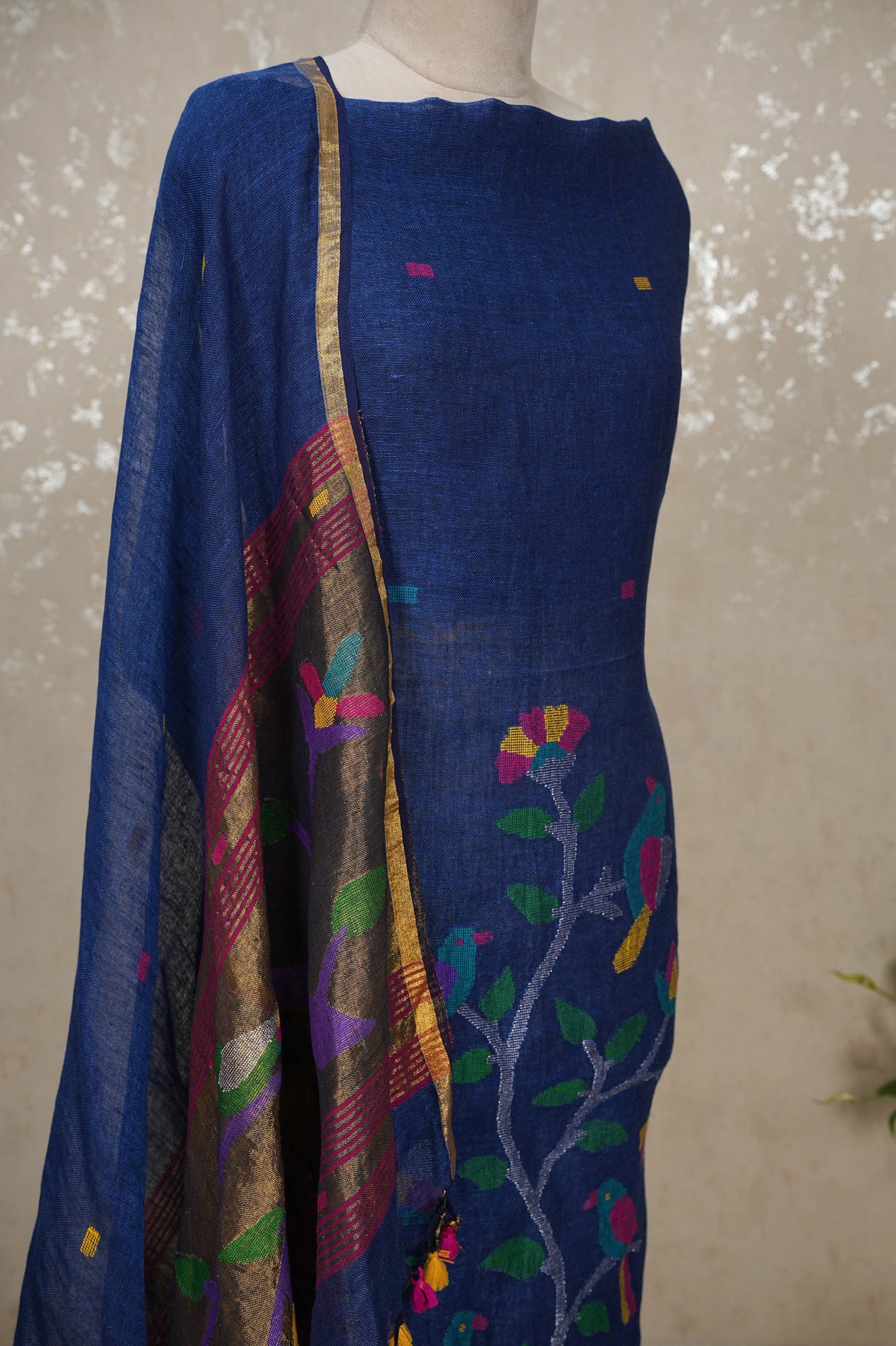 Embrace traditional elegance with this Paithani Jamdani handloom 2-piece suit, a perfect blend of heritage craftsmanship and contemporary charm. The shirt showcases peacock motifs intricately woven into the fabric, reflecting timeless artistry and attention to detail.