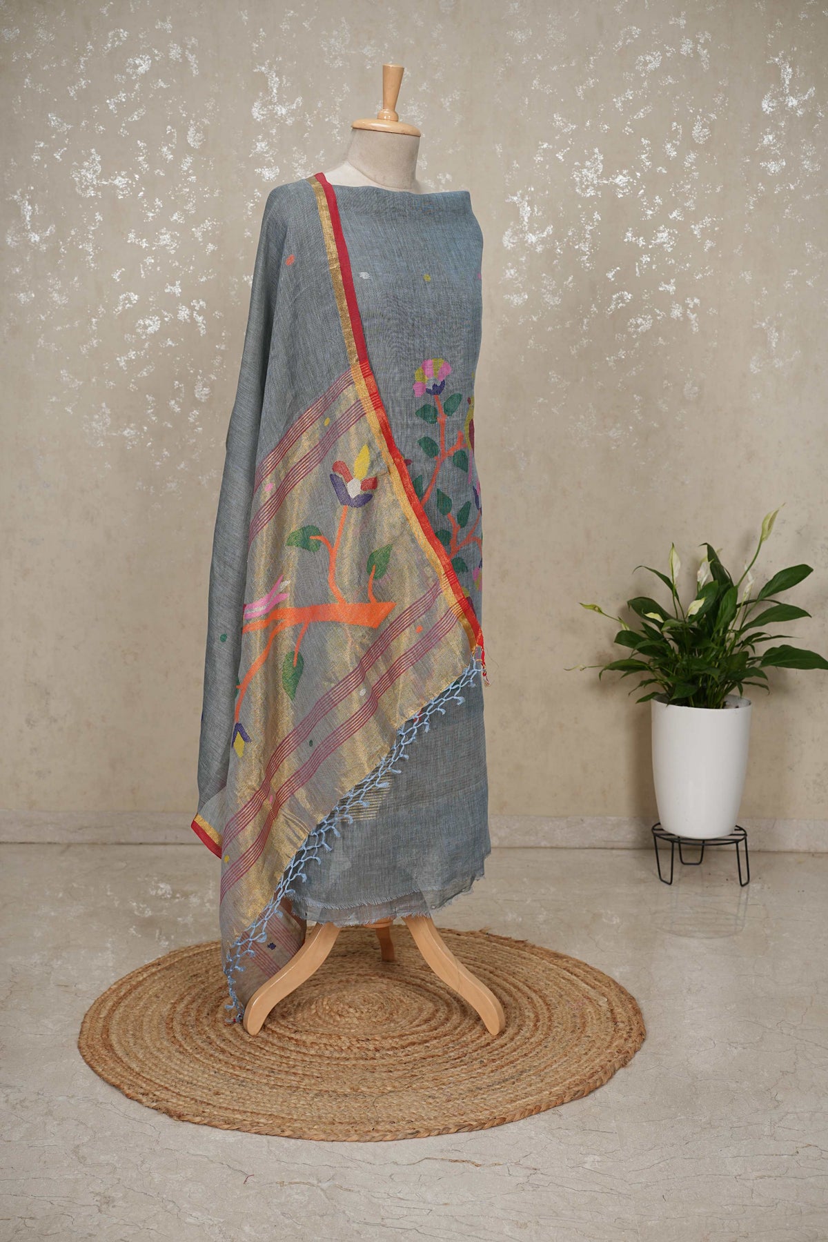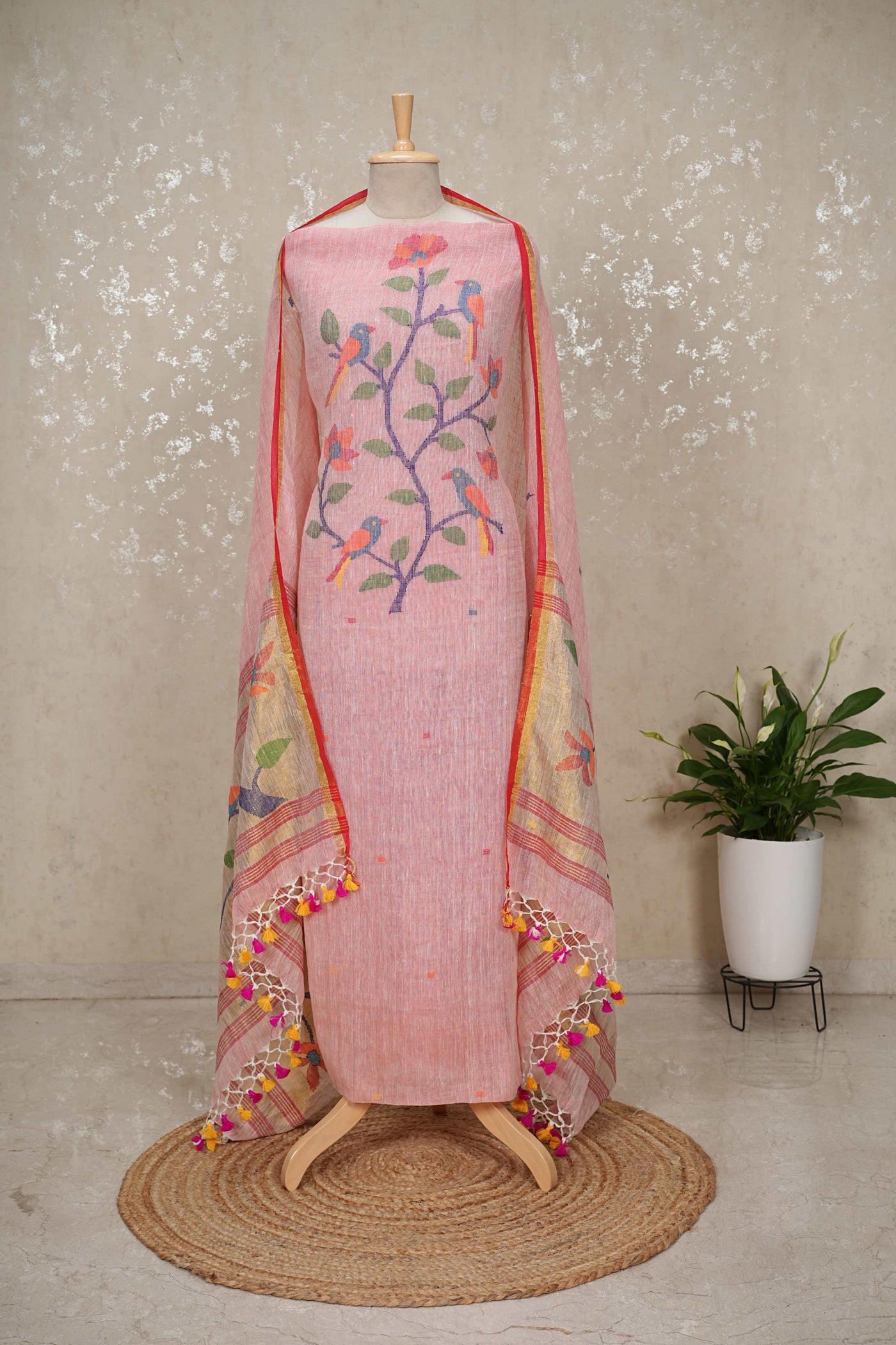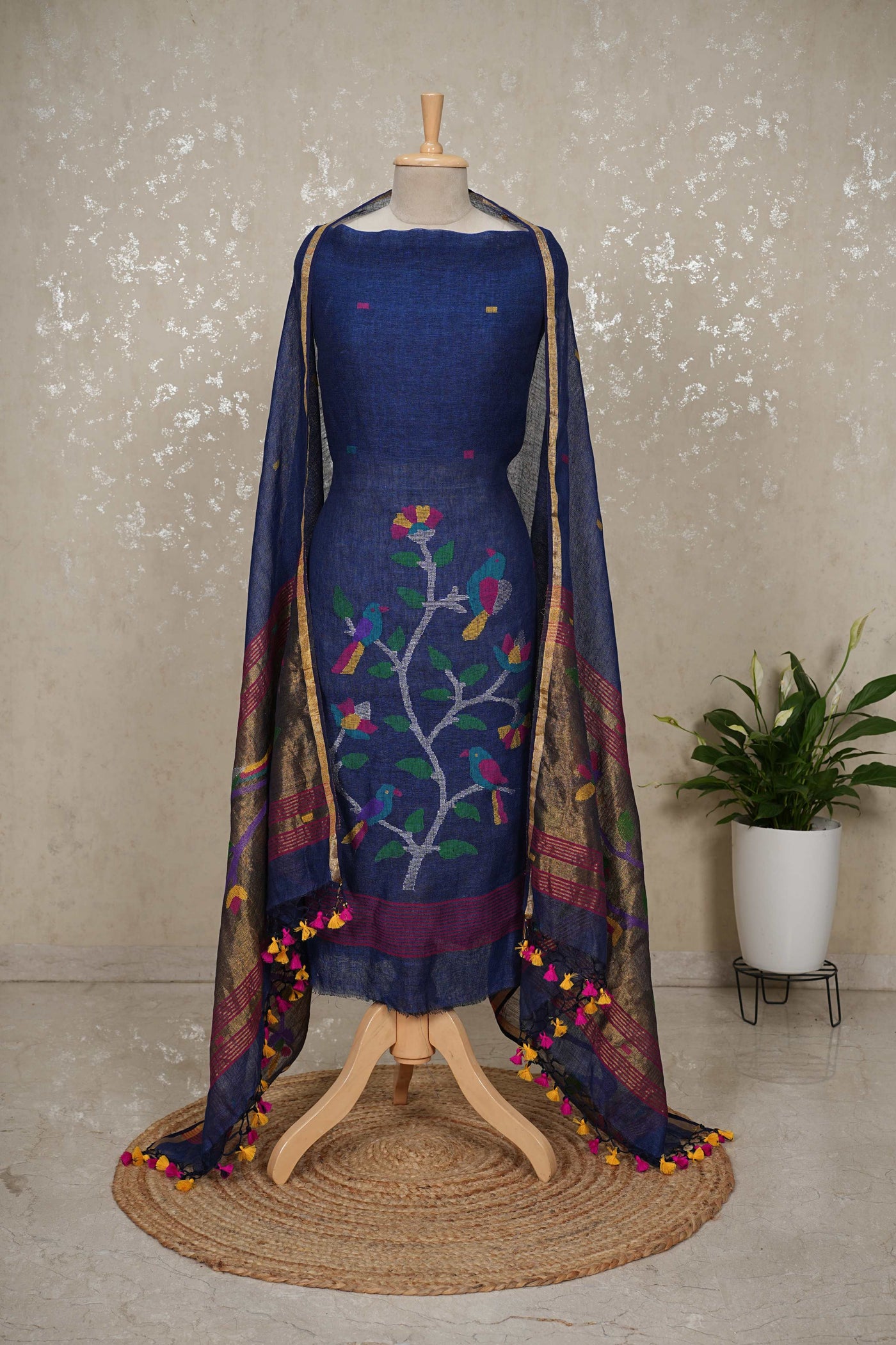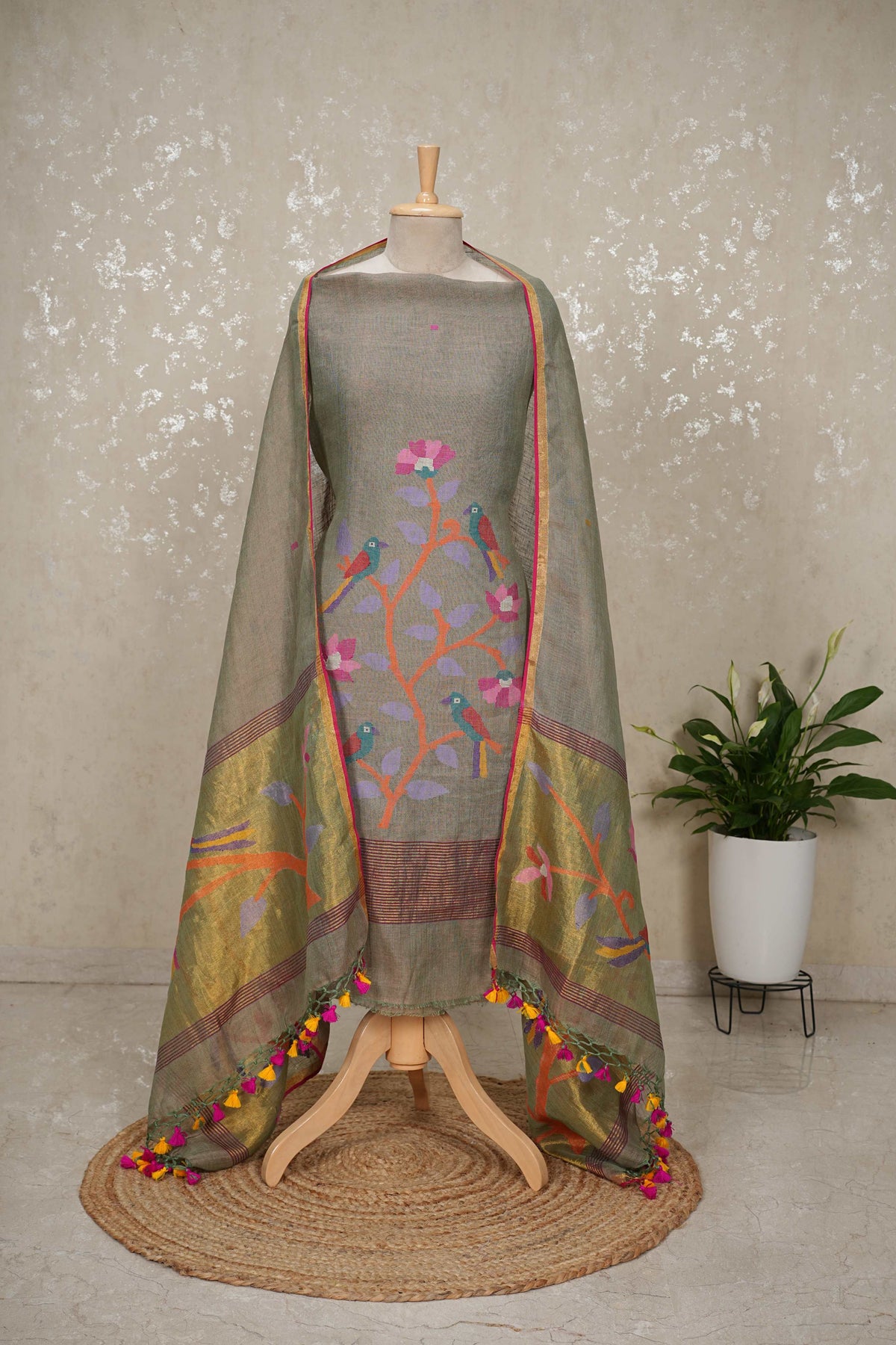 Embrace traditional elegance with this Paithani Jamdani handloom 2-piece suit, a perfect blend of heritage craftsmanship and contemporary charm. The shirt showcases peacock motifs intricately woven into the fabric, reflecting timeless artistry and attention to detail.