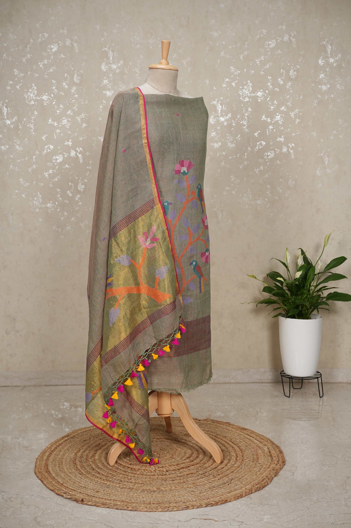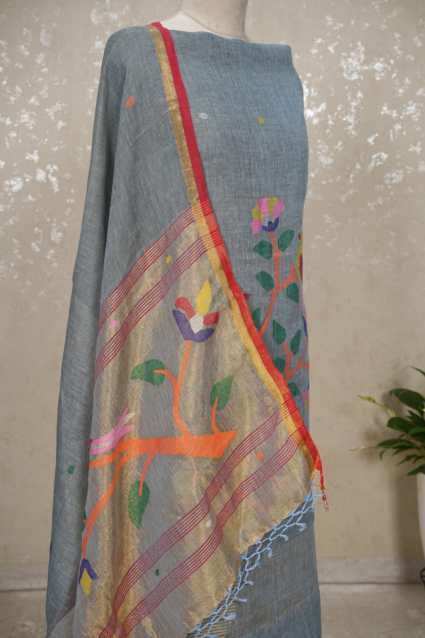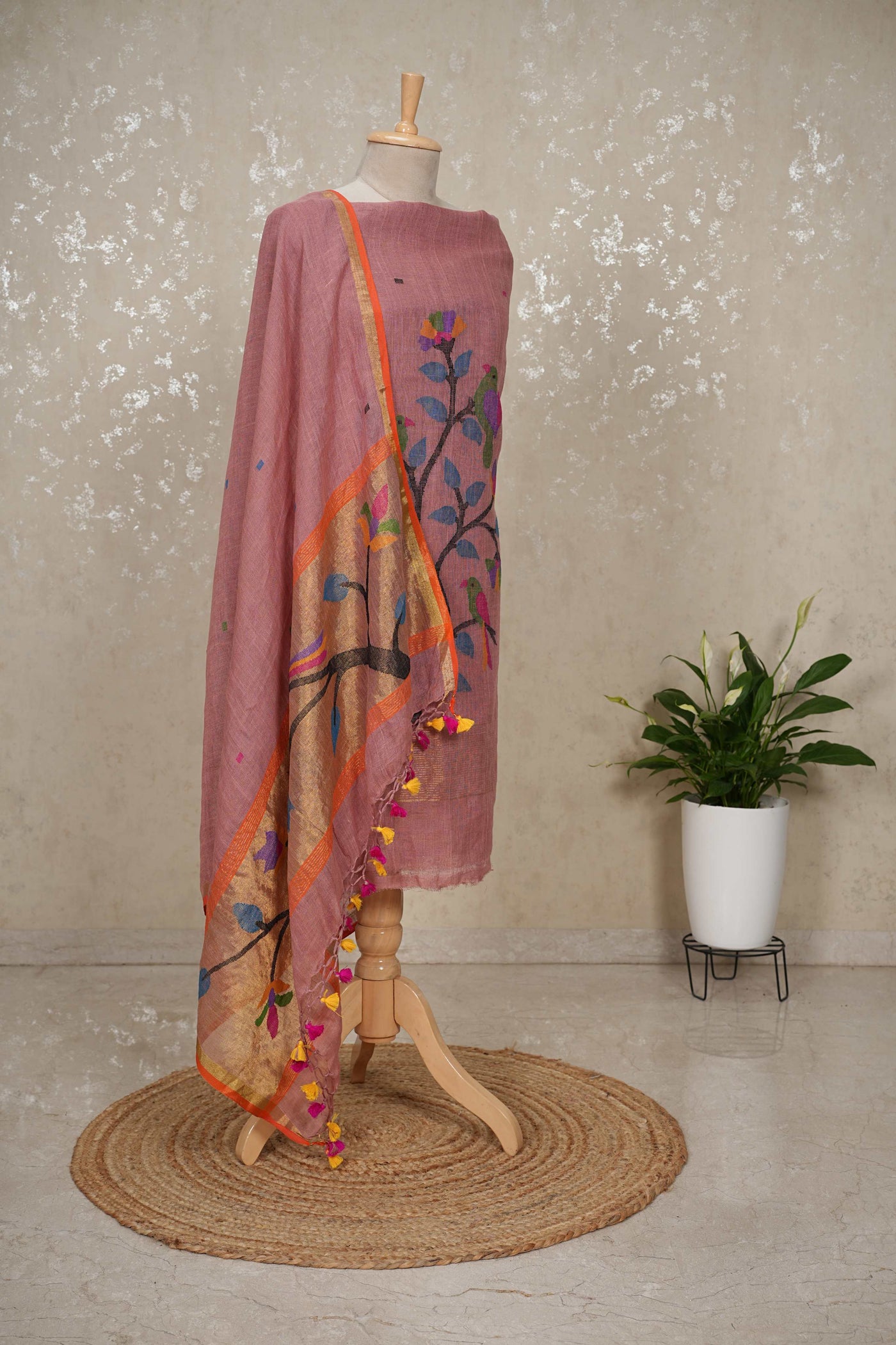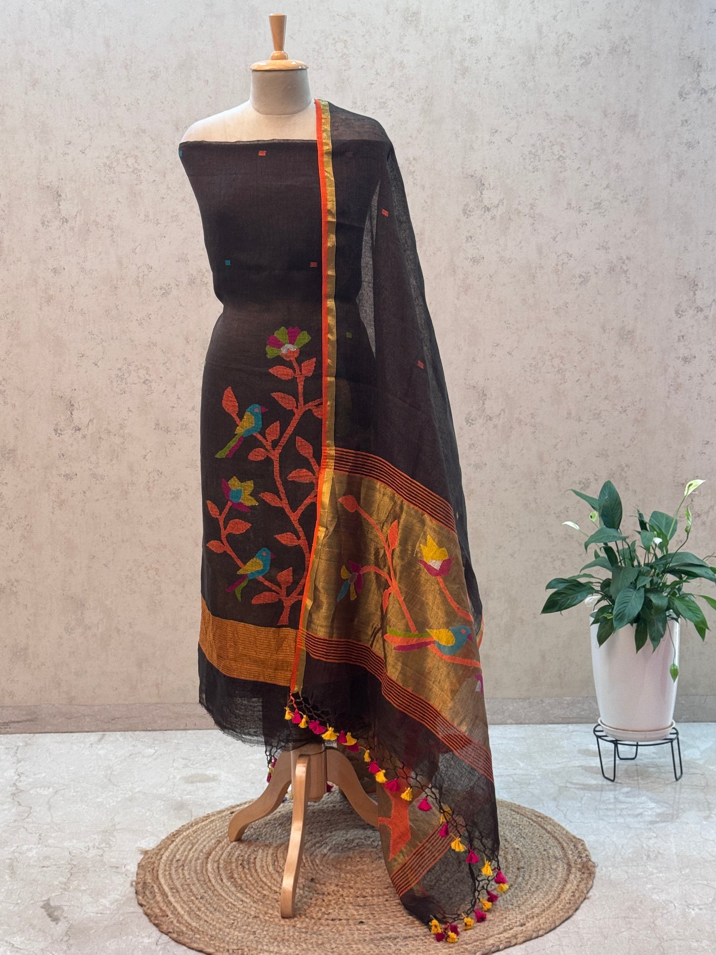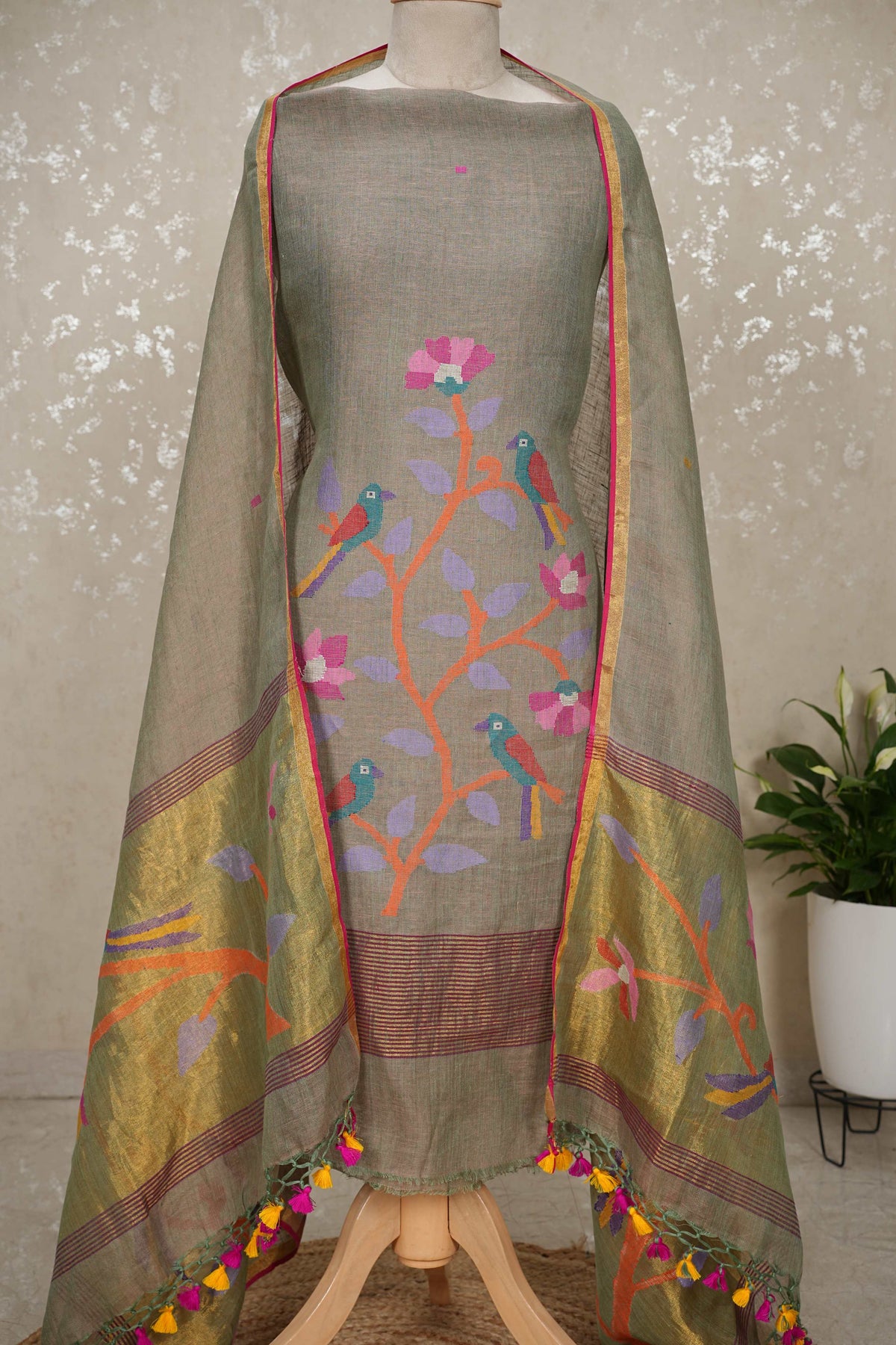 Embrace traditional elegance with this Paithani Jamdani handloom 2-piece suit, a perfect blend of heritage craftsmanship and contemporary charm. The shirt showcases peacock motifs intricately woven into the fabric, reflecting timeless artistry and attention to detail.