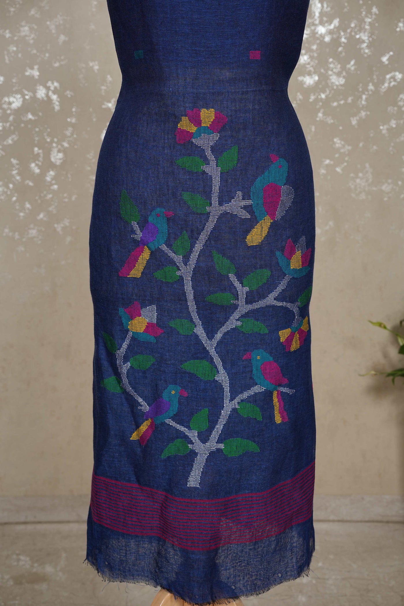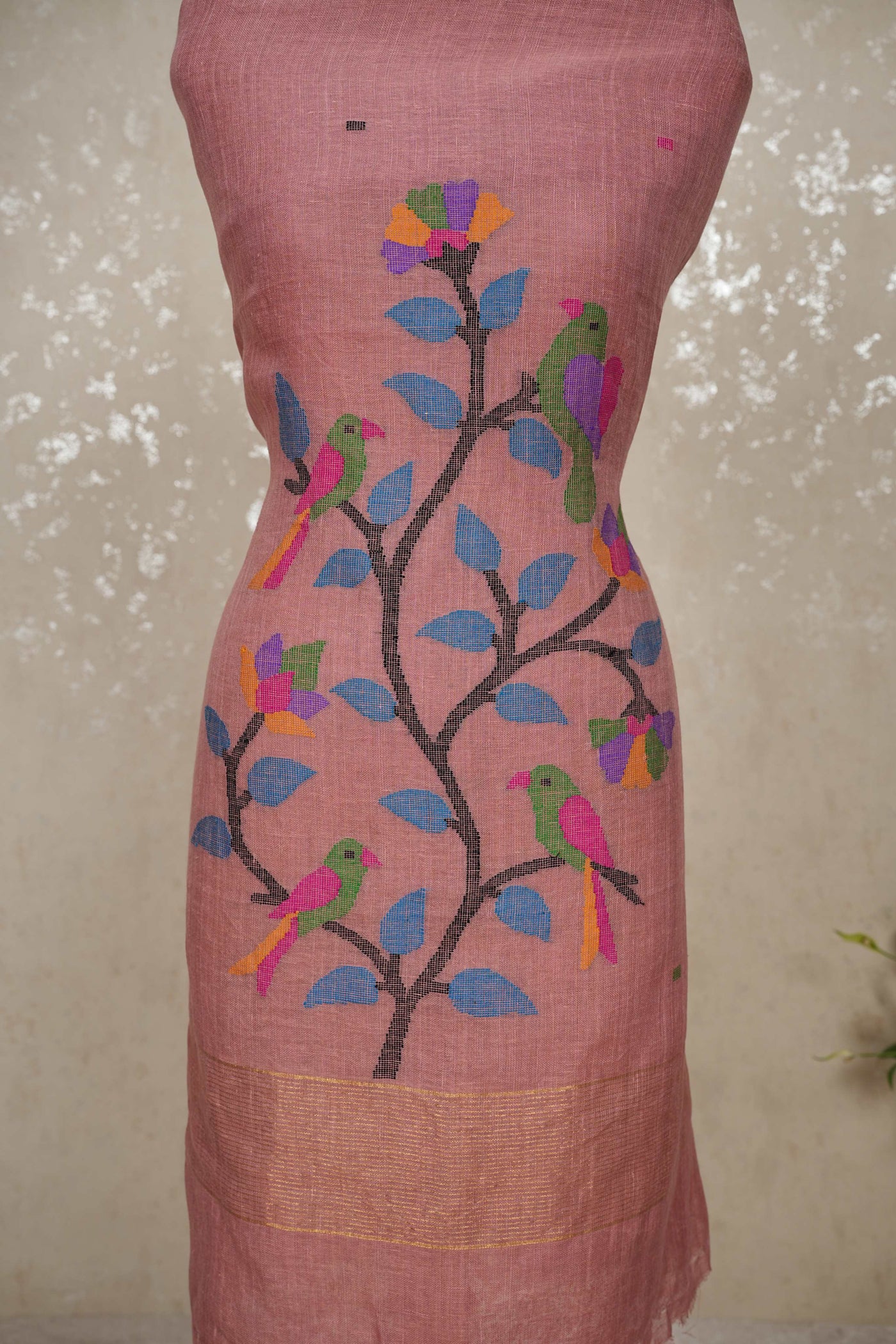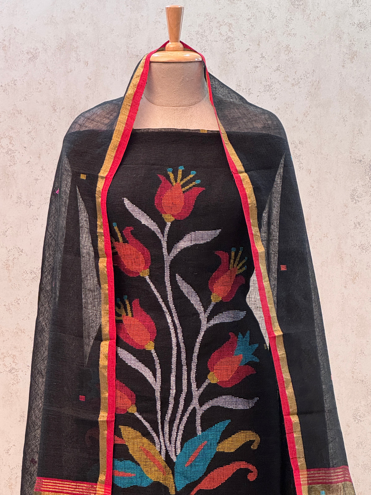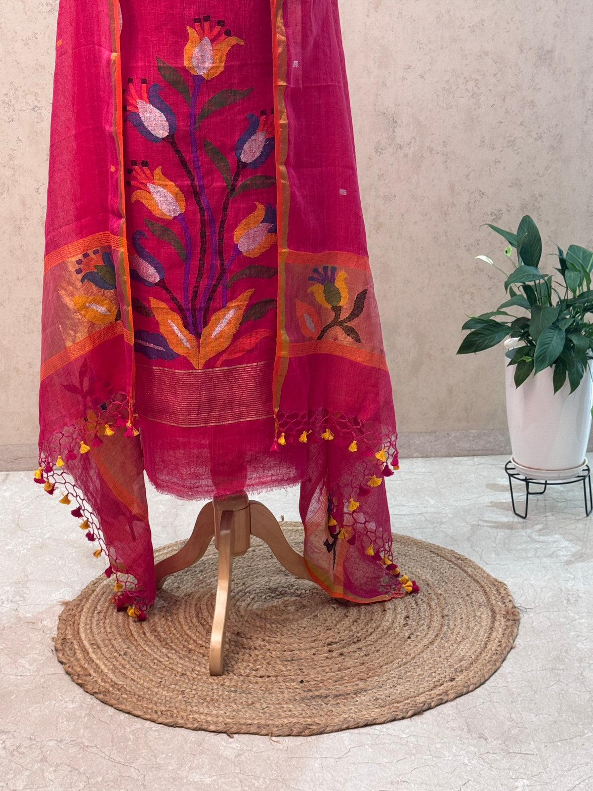 Embrace traditional elegance with this Paithani Jamdani handloom 2-piece suit, a perfect blend of heritage craftsmanship and contemporary charm. The shirt showcases peacock motifs intricately woven into the fabric, reflecting timeless artistry and attention to detail.