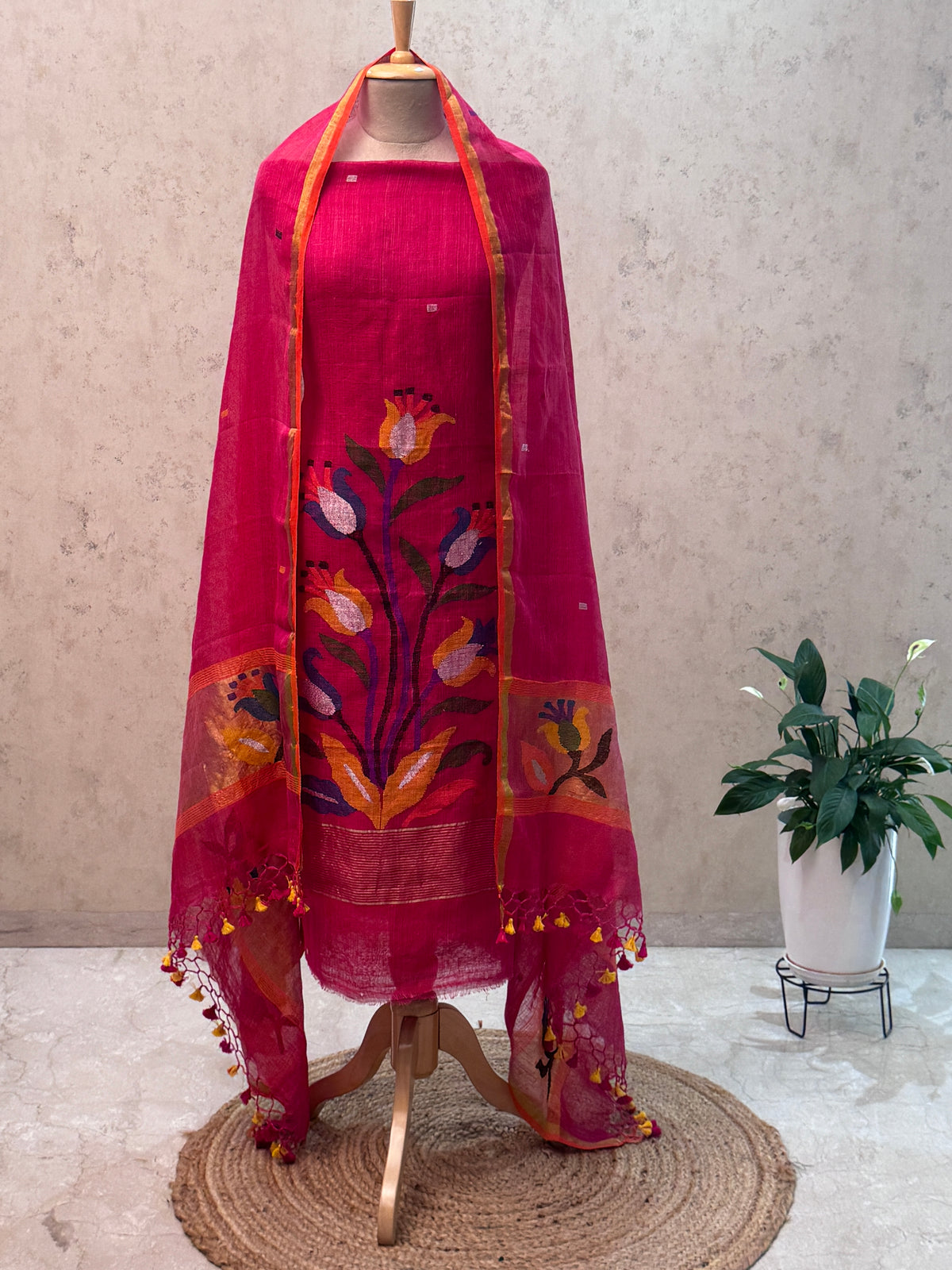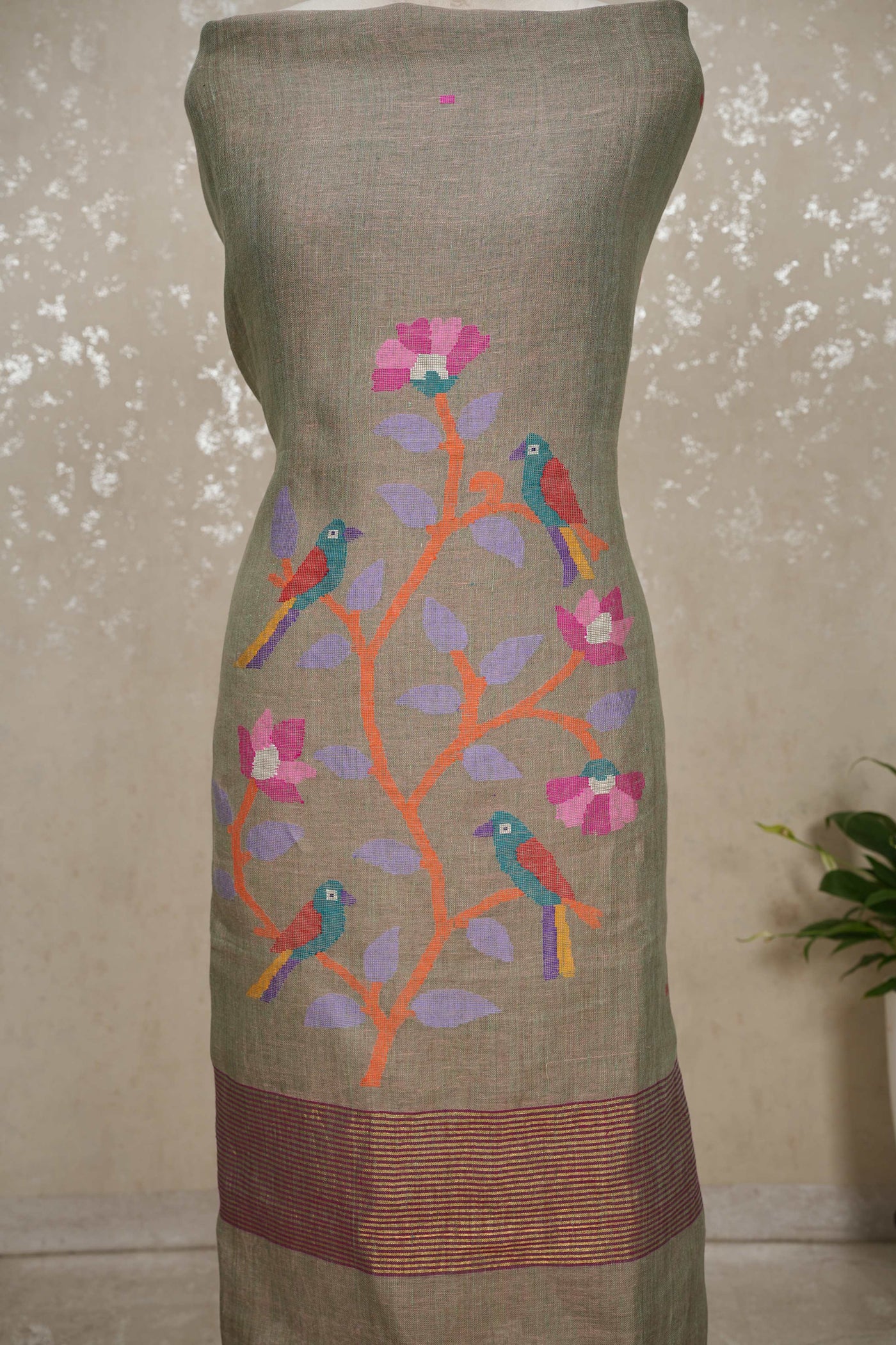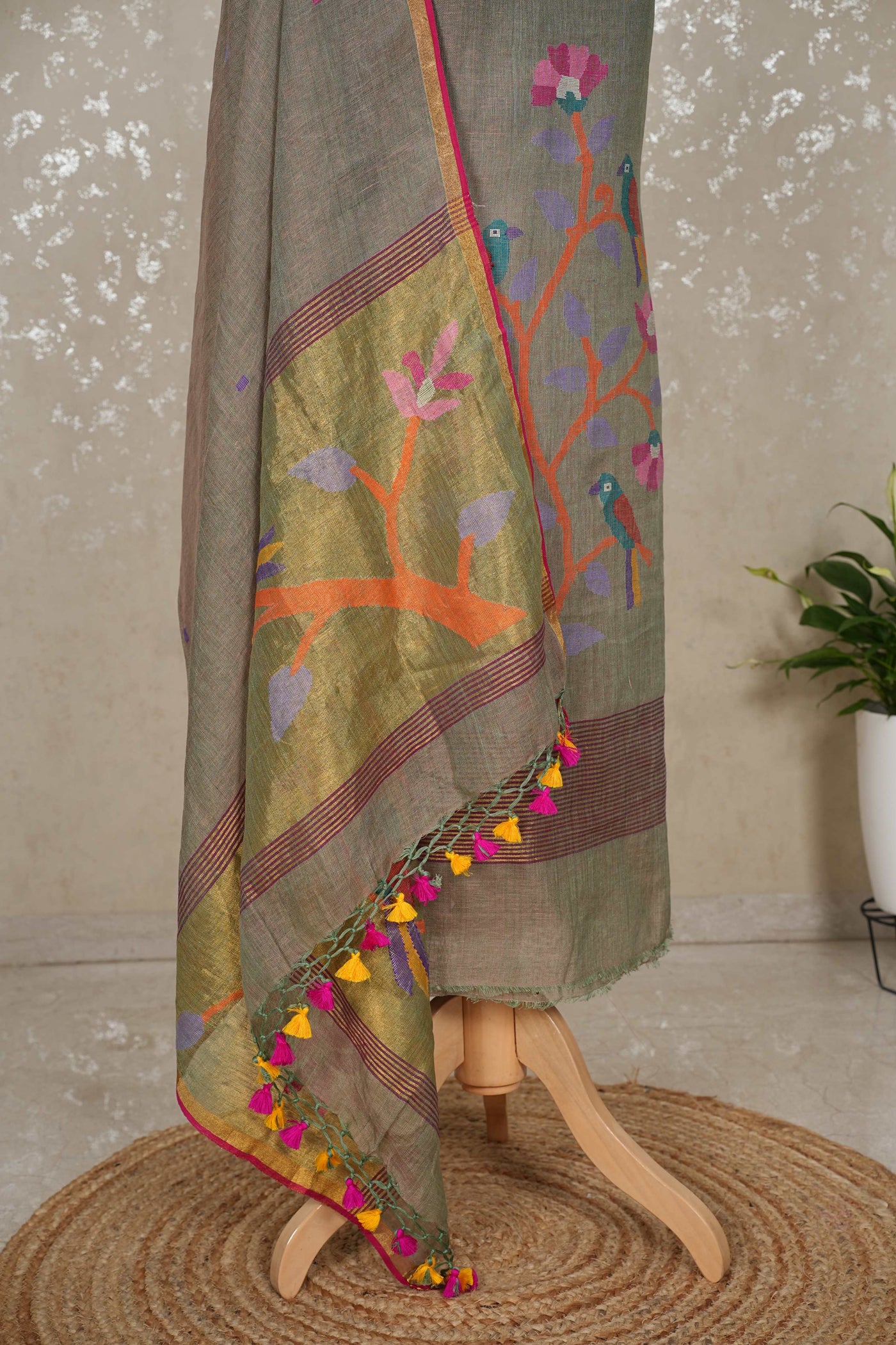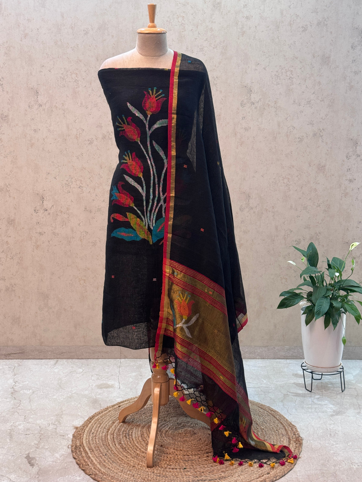 Embrace traditional elegance with this Paithani Jamdani handloom 2-piece suit, a perfect blend of heritage craftsmanship and contemporary charm. The shirt showcases peacock motifs intricately woven into the fabric, reflecting timeless artistry and attention to detail.