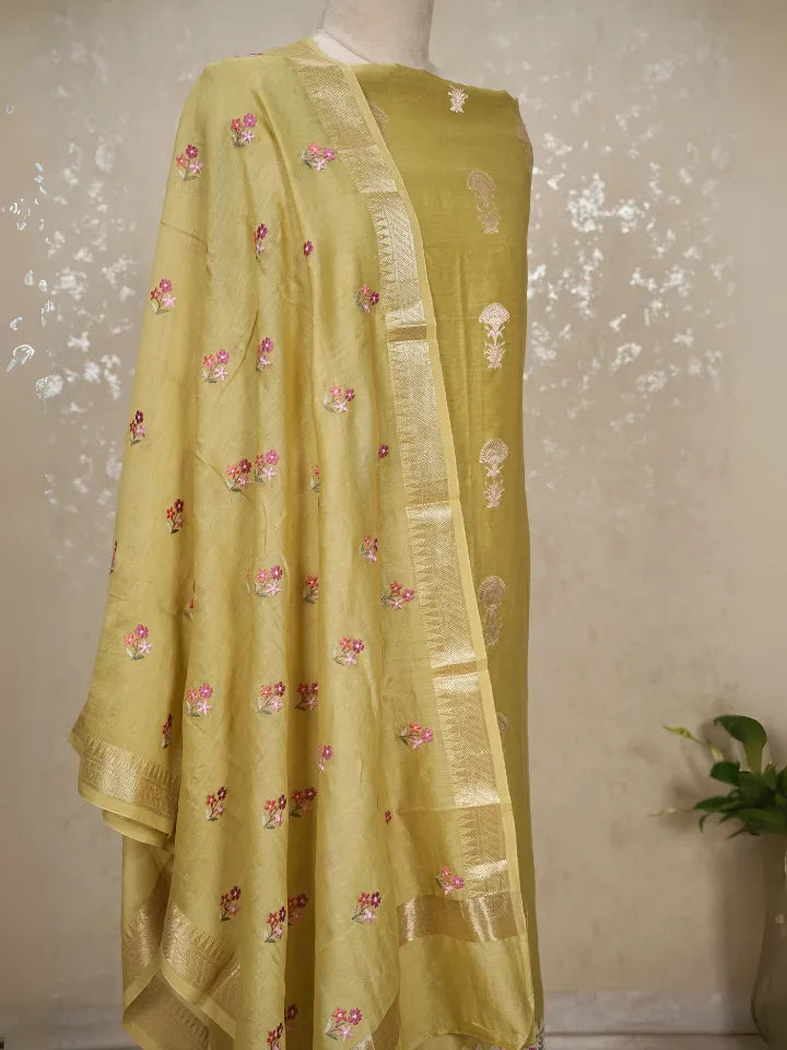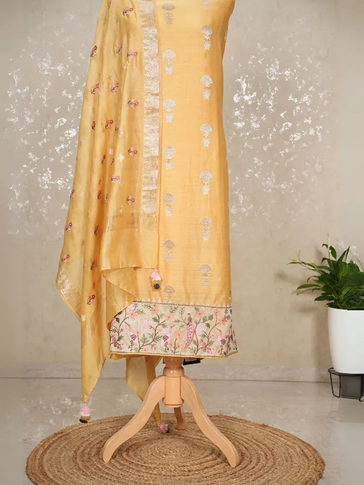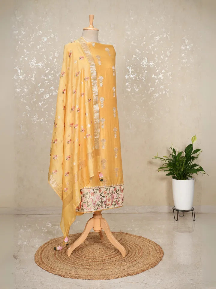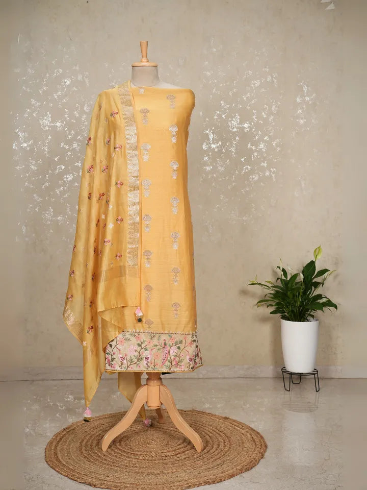 Bring home the charm of tradition with this stunning Yellow Banarasi Chanderi Suit . The shirt is adorned with Banarasee butta all over, paired with an embroidered hem that adds richness and intricate detailing. The dupatta mirrors the beauty of the shirt, showcasing Banarasee butta throughout, delicate embroidery, and finished with beautiful tassels for an elegant festive touch.