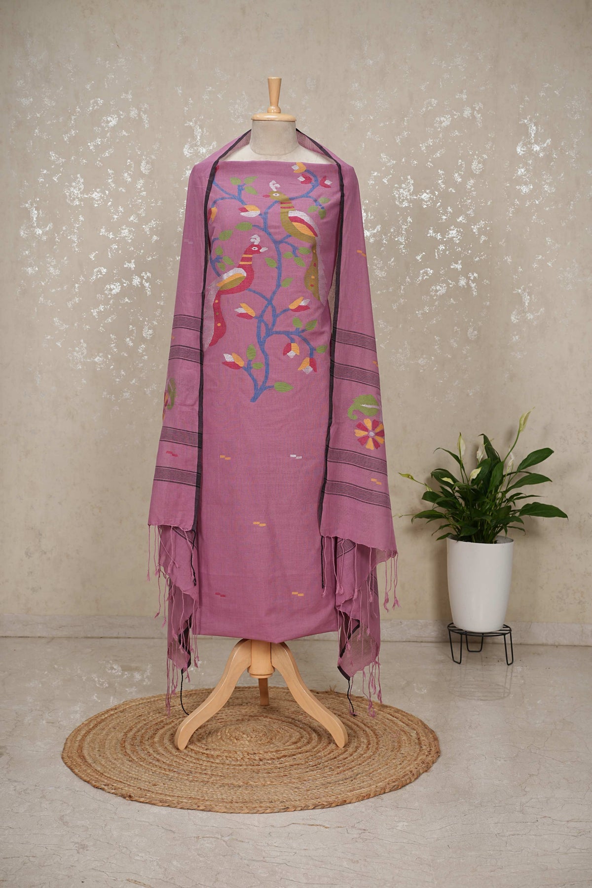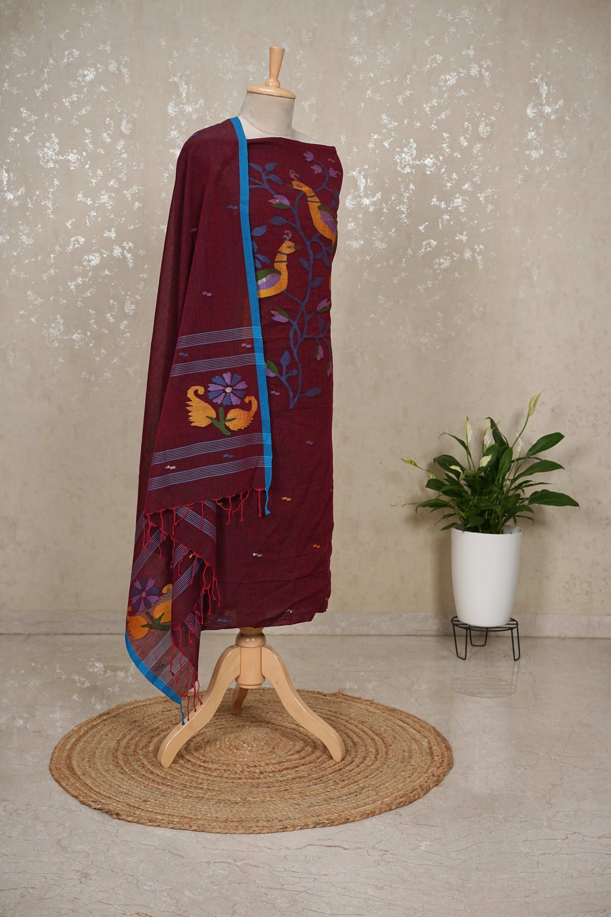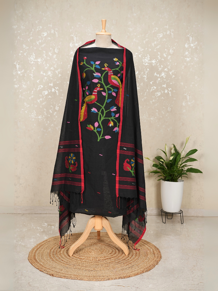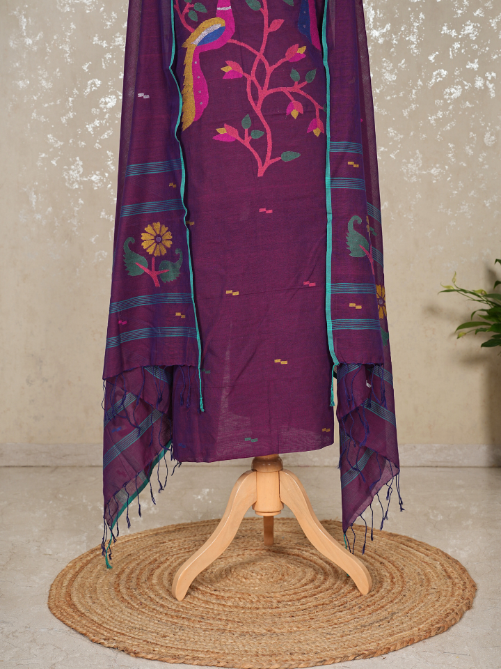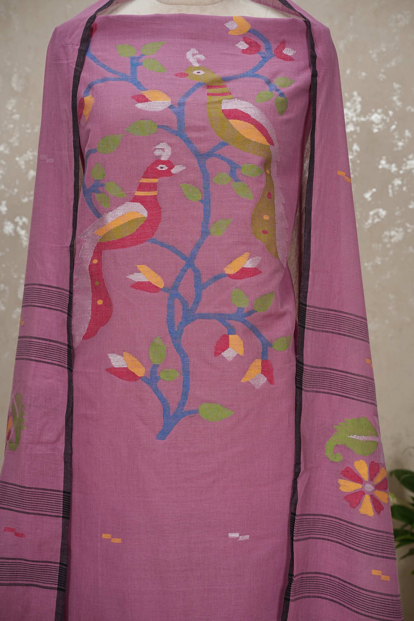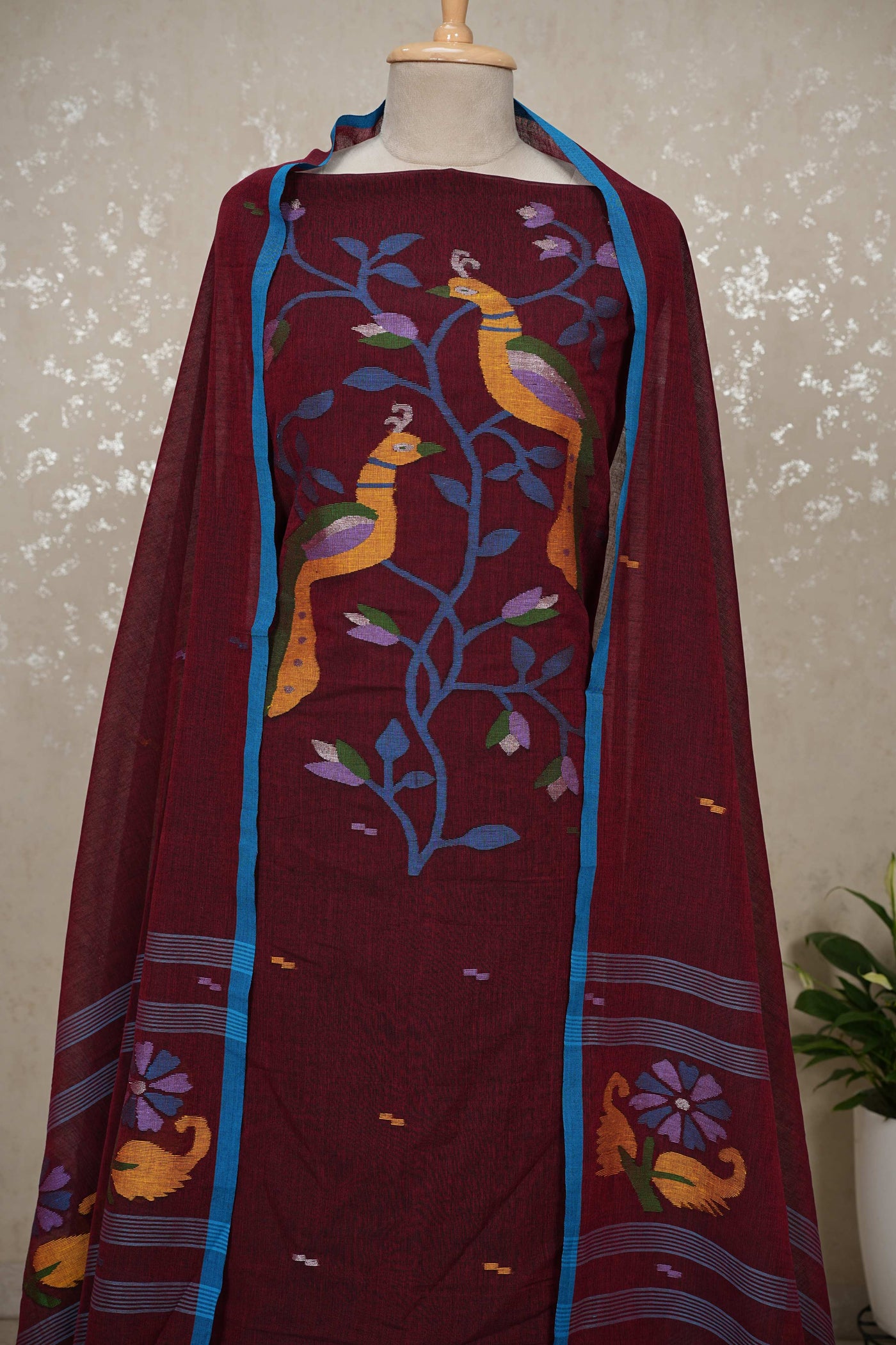 The highlight of the ensemble is the peacock Jamdani design, adding a regal and artistic touch to the fabric. Made from 100% pure cotton, the suit offers a soft, breathable, and luxurious feel, making it perfect for both comfort and style.