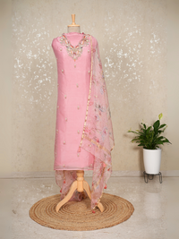 Organza silk 3pc suit set with hand embroidery on neck and shirt and dupatta ,with pure crepe bottoms , extra embroidery for sleeves included - Light Pink