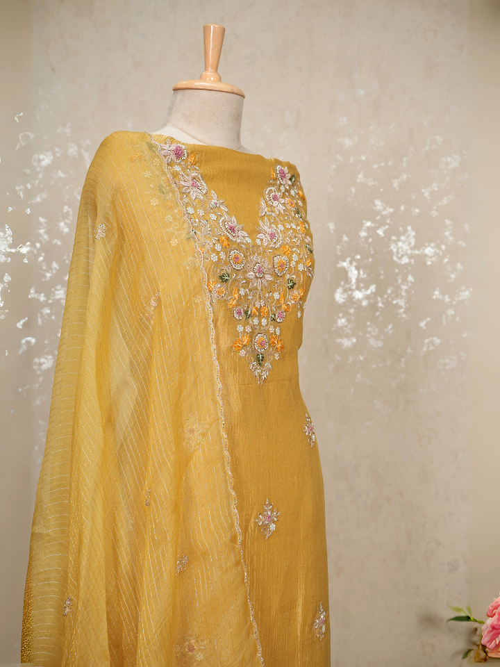 Step into luxury with our pure crush tissue suit set, crafted to reflect regal sophistication. The shirt and dupatta are adorned with exquisite Zardozi work all over, showcasing fine artistry that makes the outfit shine with timeless grace.